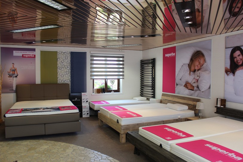 Matelas Superba, duvets Dorbena, stores Luxaflex, rembourrage et recouvrage de meubles.